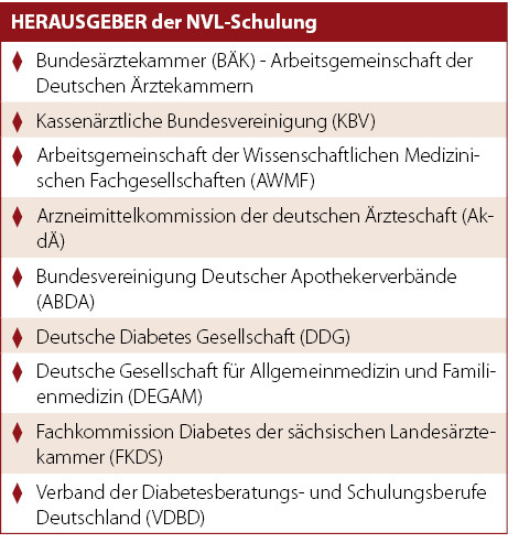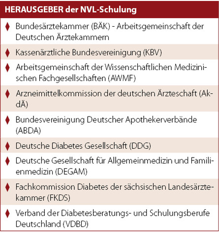 Im Sommer 2011 stand die Leitlinie drei Monate zur öffentlichen Diskussion, so dass jeder die Möglichkeit hatte, Kommentare abzugeben oder auf bislang nicht berücksichtigte Literaturstellen hinzuweisen. Nach den Versorgungsleitlinien zu Fuß-, Netzhaut-, Nieren- und Nervenkomplikationen bei Diabetes ist die NVL Schulung die 5. NVL-Leitlinie, die nicht alleine von der DDG, sondern einer ganzen Reihe unterschiedlicher Institutionen erarbeitet wurde (Tab. 1). Die NVL zur Therapieplanung bei Typ 2 wird derzeit abschließend diskutiert und überarbeitet.