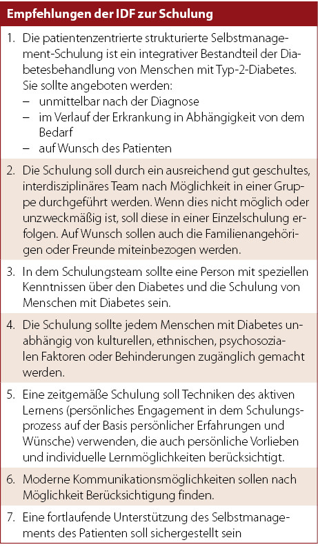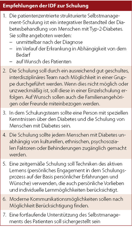 Ein Blick in die internationalen Leitlinien anderer Verbände und Organisationen zeigt, dass die Schulung weltweit eine anerkannte, unverzichtbare Therapiemaßnahme bei Menschen mit Diabetes darstellt und eine wesentliche Grundvoraussetzung für den eigenverantwortlichen Umgang mit dem Diabetes ist. Hier stimmen alle internationalen Leitlinien überein, auch mit der im Jahr 2012 in einer überarbeiteten Fassung herausgegebenen internationalen Leitlinie des IDF (Tab. 2). Auch besteht eine hohe Übereinstimmung mit dem Kapitel "Psychoedukation" der "Psychosozialen Leitlinien" der DDG, die im Moment in einer ebenfalls überarbeiteten Version zur Diskussion stehen und 2013 veröffentlicht werden.