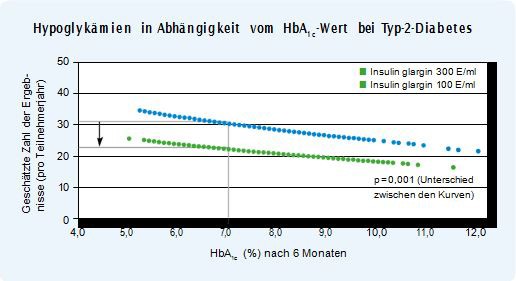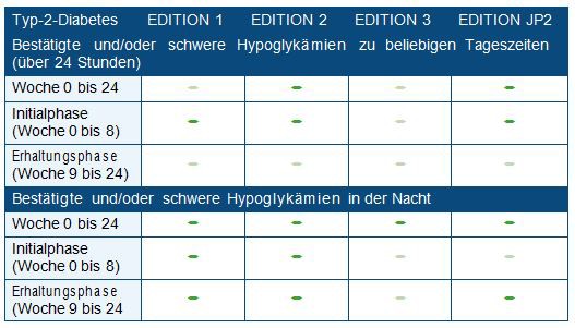 Diese Ansprüche werden von Insulin glargin 300 E/ml erfüllt. So war die Behandlung von Typ-2-Diabetespatienten mit Insulin glargin 300 E/ml in den Studien EDITION 1, 2 und 3 ebenso wirksam wie die Therapie mit Insulin glargin 100 E/ml. Bestätigte (≤ 70 mg/dl bzw. ≤ 3,9 mmol/l) oder schwere Hypoglykämien waren in allen drei Studien unter Insulin glargin 300 E/ml entweder signifikant seltener oder tendenziell seltener als unter Insulin gl 100 E/ml. Dies galt ebenso für die in Japan durchgeführte EDITION JP2-Studie.