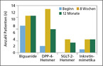Besonders häufig kamen Metformin und ein DPP4-Hemmer zum Einsatz. 8 Wochen nach Entlassung wurde die medikamentöse Umstellung des Krankenhauses bei den Patienten im Wesentlichen beibehalten. Nach 12 Monaten sieht man ein differenziertes Bild. Während Metformin nicht abgesetzt wurde, reduzierte sich die Anzahl der Patienten mit DPP4-Hemmern deutlich. Eingesetzte SGLT2-Blocker und Inkretinmimetika wurden in der Regel belassen (siehe Grafik 1).
