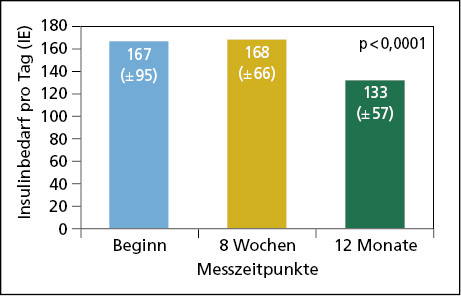 Diese Patienten wiesen einen BMI > 30 kg/m² und einen Insulinbedarf von > 1 IE/kg Körpergewicht auf. Es wurden die Entwicklung der Diabetestherapie, d.h. der eingesetzten Medikamente und der Insulindosen, des HbA1c sowie des Körpergewichts zu Beginn des stationären Aufenthaltes, 8 Wochen nach Intervention und nach 12 Monaten analysiert.