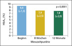 Durch das Behandlungskonzept des Diabeteszentrums Bad Lauterberg besserte sich 8 Wochen nach stationärem Aufenthalt der HbA1c von 9,4% (± 1,3) auf 7,9% (± 2,5). Dieser Effekt ließ sich auch nach 12 Monaten nachweisen. Der HbA1c konnte dauerhaft signifikant (p<0,0001) gesenkt werden. Er betrug ein Jahr nach stationärer Intervention 7,8% (± 2,0) und war damit nochmals niedriger als 8 Wochen nach stationärer Behandlung (siehe Grafik 5).