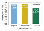Auch beim Gewichtsverhalten gab es einen signifikanten Effekt. Bereits nach 8 Wochen erreichten 72% der Patienten eine Gewichtsreduktion. Nach 12 Monaten nahmen viele Patienten nochmals Gewicht ab (siehe Grafik 6). Das Durchschnittsgewicht der Patienten sank von 114,4 (± 25,1) auf 108,9 (± 21,7). Wie auch in anderen Untersuchungen beschrieben, profitierten nicht alle Patienten.