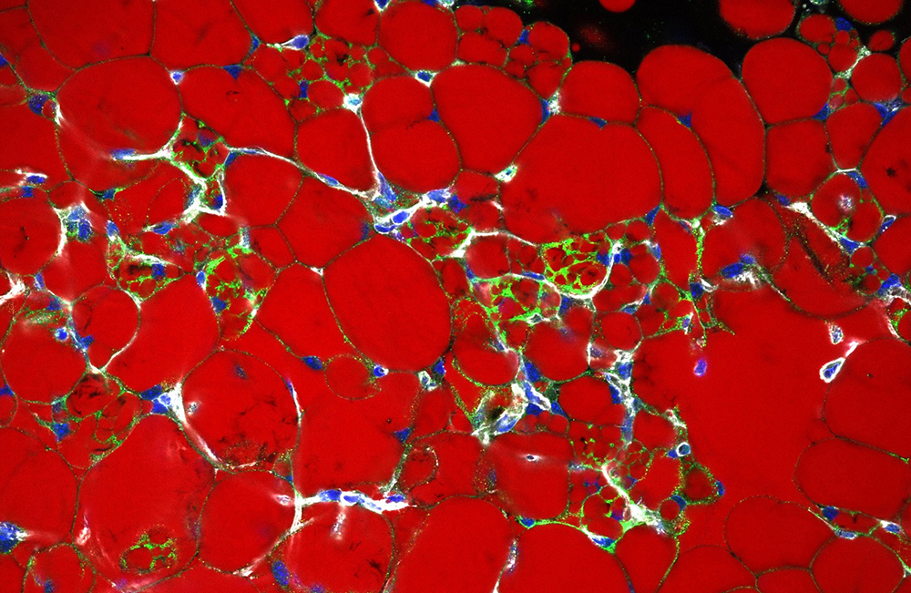 Beige Fettzellen im weißen Fettgewebe. (Beige Fettzellen mit UCP-1 in grün gefärbt. Lipide sind rot und F-Actin, das die Zellen und insbesondere die Blutgefäße umrandet, grau, DNA ist blau)