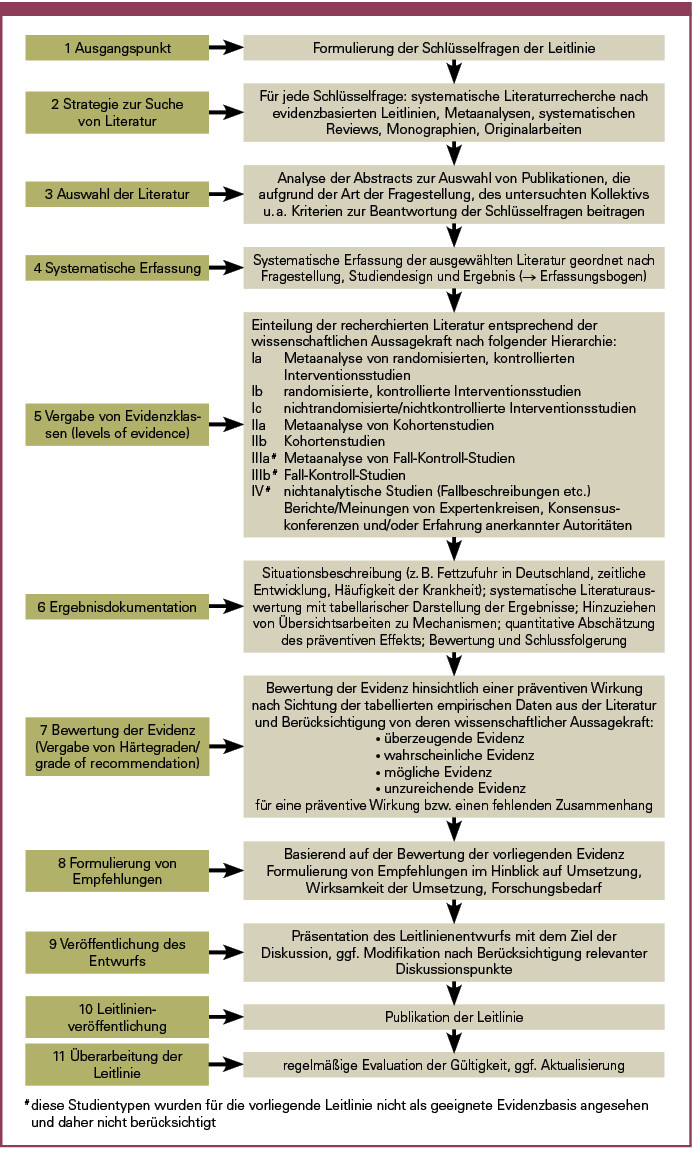 Alle DGE-Leitlinien orientieren sich an der Methodik der evidenzbasierten Medizin (EbM), die auf die Prävention durch Ernährung übertragen wurde. Hierzu wurden in der wissenschaftlichen Literatur verfügbare epidemiologische Studien (Interventionsstudien, Kohortenstudien und darauf basierende Metaanalysen), die den Zusammenhang zwischen quantitativer und qualitativer Fettaufnahme und dem Erkrankungsrisiko untersucht hatten, systematisch erfasst (siehe Abbildung 1). Eingang in die Datenauswertung fanden die bis zum 30.06.2012 veröffentlichten Untersuchungen bzw. die bis zum 27.10.2014 publizierten Metaanalysen.