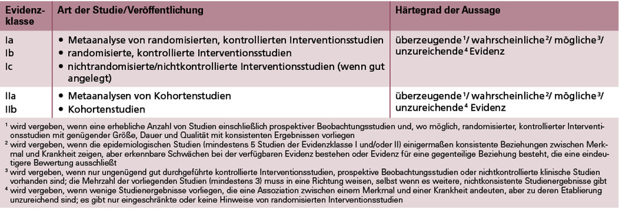 Nach der Literaturrecherche und Erfassung der Studienergebnisse wurden die identifizierten Studien den beiden Evidenzklassen I (Interventionsstudien) und II (Kohortenstudien) zugeordnet (siehe Tabelle 1). Darauf aufbauend wurde – in Anlehnung an das Bewertungsschema der Weltgesundheitsorganisation (2) – eine Bewertung der Evidenz nach vier Härtegraden vorgenommen (3):