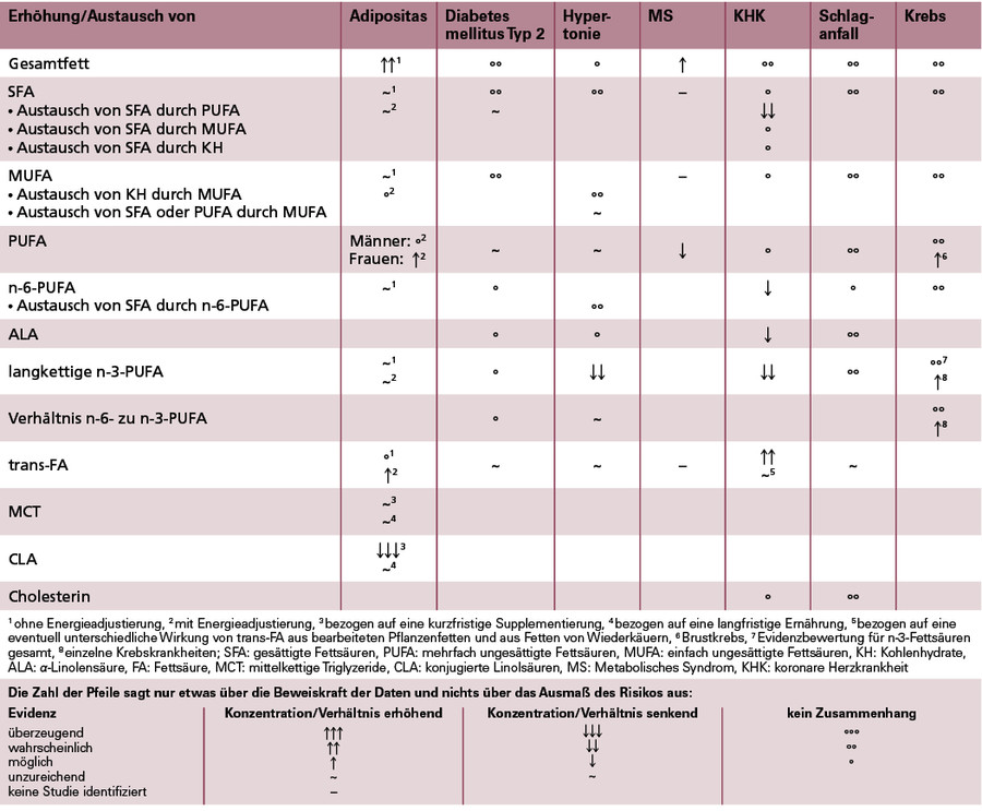 Der Zusammenhang zwischen dem Anstieg der Menge bzw. des Anteils des Gesamtfetts an der Energiezufuhr mit dem Adipositasrisiko wurde als wahrscheinlich gewertet. Dies gilt jedoch nur unter Ad-libitum-Bedingungen mit unkontrollierter Energiezufuhr, d. h. bei hyperkalorischer Ernährung. Unter isokalorischen Verhältnissen (Energiezufuhr entspricht dem Verbrauch) findet sich erwartungsgemäß kein Hinweis auf einen risikosteigernden Effekt des Fettanteils. Die Evidenz für einen fehlenden Zusammenhang gilt als wahrscheinlich. Für alle übrigen "harten" klinischen Endpunkte, darunter Typ-2-Diabetes, Hypertonie, KHK, Schlaganfall und Krebskrankheiten, konnte für den Fettanteil kein risikomodifizierender Effekt nachgewiesen werden. Die Evidenz für einen fehlenden Zusammenhang wurde als wahrscheinlich gewertet (1) (siehe Tabelle 2).