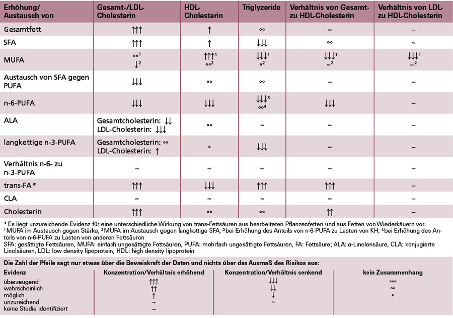 Die Evidenzbewertung zur Assoziation der quantitativen sowie qualitativen Fettaufnahme und des Lipidprofils bzw. des Risikos für Dyslipoproteinämien ist Tabelle 3 zu entnehmen. Präventivmedizinisch von Bedeutung ist insbesondere der Effekt auf die Serum-Triglyzeride, das Verhältnis von Gesamt- zu LDL- bzw. HDL-Cholesterin und auf den LDL/HDL-Quotienten. Die Ergebnisse stellen sich wie folgt dar:
