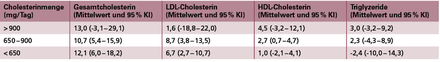 Interessant ist ferner das Ergebnis einer kürzlich veröffentlichten Metaanalyse von 17 Interventionsstudien: Ein statistisch signifikanter Effekt auf Gesamt-, LDL- und HDL-Cholesterin war hier nur für eine Cholesterinzufuhr von 500 bis 900 mg, nicht aber für eine Cholesterindosis > 900 mg pro Tag nachweisbar (siehe Tabelle 1), was für eine Sättigungskinetik spricht (38).