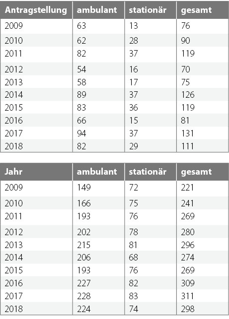 2018 wurden 111 Anträge aus ambulanten wie klinischen Einrichtungen gestellt. In den letzten 10 Jahren wurden etwa zwei Drittel der jährlichen Anträge aus ambulanten Einrichtungen und etwa ein Drittel der Anträge aus klinischen Einrichtungen gestellt. 2018 stellten 22 Antragsteller erstmals einen Antrag auf Anerkennung als Fußbehandlungseinrichtung und 89 zum wiederholten Mal. Eine Zertifizierung wird bei vollständigem Erfüllen aller Kriterien für einen Zeitraum von 3 Jahren ausgesprochen.