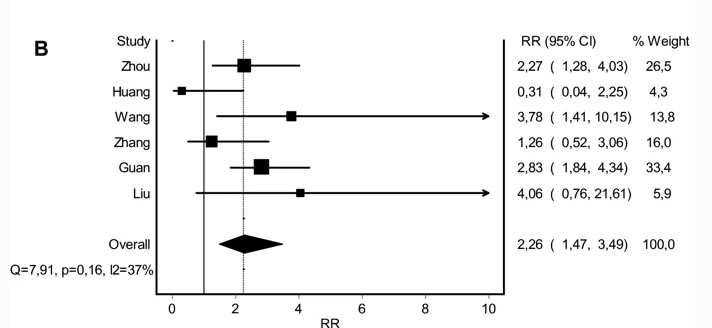 Allerdings ändert sich das Bild bei Betrachtung der schweren Verläufe aus 6 Studien: Das gepoolte Verhältnis von Diabetespatienten mit ungünstigem Krankheitsverlauf im Vergleich zu Patienten mit günstigerem Verlauf betrug 2,26 (95% CI 1,47-3,49).