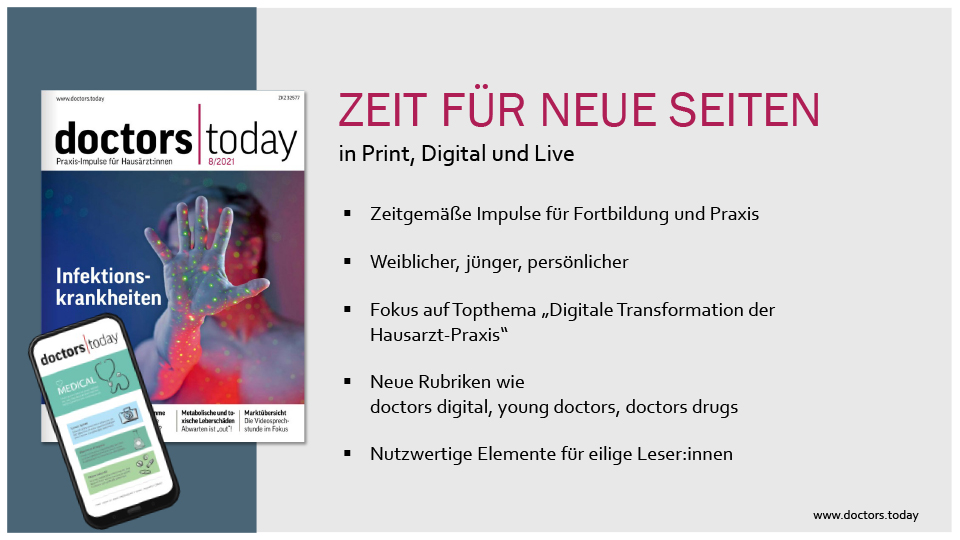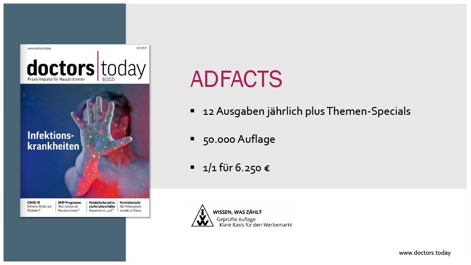 doctors|today bringt monatlich mit einer Auflage von 50.000 Heften pro Ausgabe und zwölf Ausgaben pro Jahr alles Wichtige aus der Welt der Allgemeinmedizin in die Hausarztpraxen.