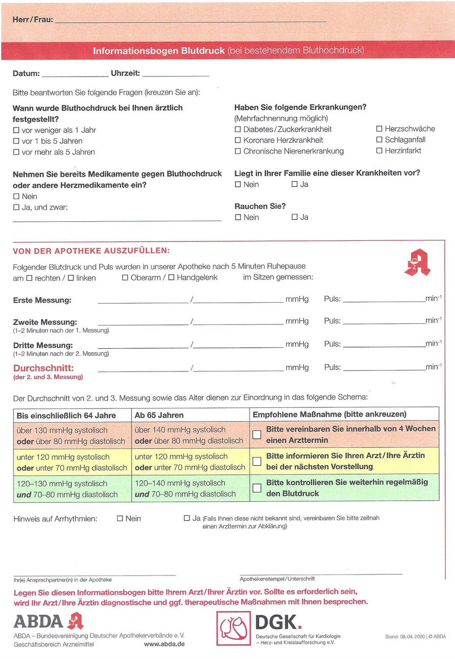 Etwa 30 Prozent der Erwachsenen in Deutschland leiden unter Bluthochdruck, auch viele Diabetiker sind davon betroffen. Wird nicht ausreichend behandelt, steigt das Risiko für Herzinfarkt, Schlaganfall oder Organschäden deutlich an. Wer Medikamente gegen Bluthochdruck verschrieben bekommt, sollte sich deswegen regelmäßig vergewissern, dass seine Werte ‚im grünen Bereich‘ liegen. Die standardisierte Blutdruckmessung in der Apotheke hilft dabei. Wer dauerhaft blutdrucksenkende Arzneimittel einnimmt, hat alle zwölf Monate Anspruch auf die intensive Messung in der Apotheke. Die Kosten dafür übernimmt die Krankenkasse. Da der Blutdruck schwanken kann, werden drei Messungen nacheinander durchgeführt. Der Mittelwert aus der zweiten und dritten Messung bildet dann ein verlässlicheres Ergebnis. Die Werte werden in einem Formular (s. Bild nächste Seite) dokumentiert und entweder an den Arzt oder an den Patienten weitergegeben. Ändert sich etwas an den Blutdruckmedikamenten kann diese Messung auch vor Ablauf der Jahresfrist erneut in Anspruch genommen werden. Ziel ist es, Patienten mit hohen Blutdruckwerten zu identifizieren und zum Arzt zu schicken, um weitere Gesundheitsrisiken zu senken. "Als ich mein Medikationsgespräch in der Apotheke geführt habe, wurde mir auch mein Blutdruck gemessen. Ich nehme bereits seit Jahren Blutdrucktabletten. Selbst messe ich nur selten, weil ich mich auch nicht verrückt machen will. Aber in der Apotheke wurde das professionell gemacht. Es ist dann auch ein gutes Gefühl, wenn die Werte in Ordnung sind. Die Ergebnisse habe ich später meiner Ärztin gezeigt. Bei meiner Bekannten wurden zu hohe Blutdruckwerte ermittelt, sie erhielt dann eine Anpassung der Tabletten", so eine Patientin.