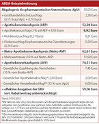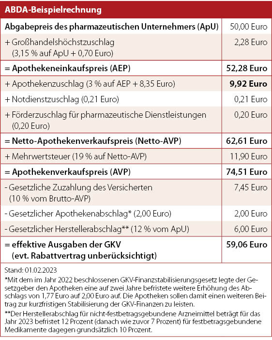 Der Abgabepreis eines rezeptpflichtigen Arzneimittels spiegelt zahlreiche gesetzlichen Vorgaben wieder, die sich kontinuierlich ändern und ist deshalb sehr komplex aufgebaut. So sind zur finanziellen Entlastung der gesetzlichen Krankenkassen für pharmazeutische Hersteller und Apotheken Abschläge und Rabatte festgelegt. Auch die Patienten werden durch die Arzneimittelzuzahlungen an der Finanzierung der Arzneimittel beteiligt. Die Beispielrechnung für ein Fertigarzneimittel (Tabelle unten) verdeutlicht, wie sich der Apothekenverkaufspreis zusammensetzt und zeigt auch, dass die Krankenkassen durch Rabatte und Abschläge effektiv deutlich weniger zahlen als der Arzneimittelpreis, der aufgrund der Arzneimittelpreisverordnung vorgesehen ist.