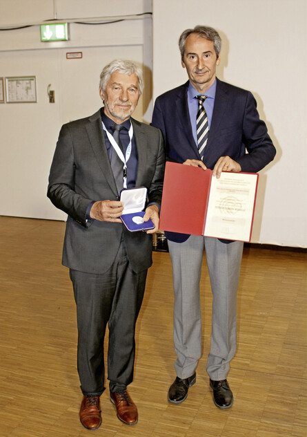 Abb. 1: Professor Dr. phil. Dr. med. habil. Karl-Heinz Ladwig (li.) erhält die Auszeichnung von Prof. Dr. med. Bernhard Schwaab.