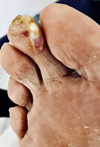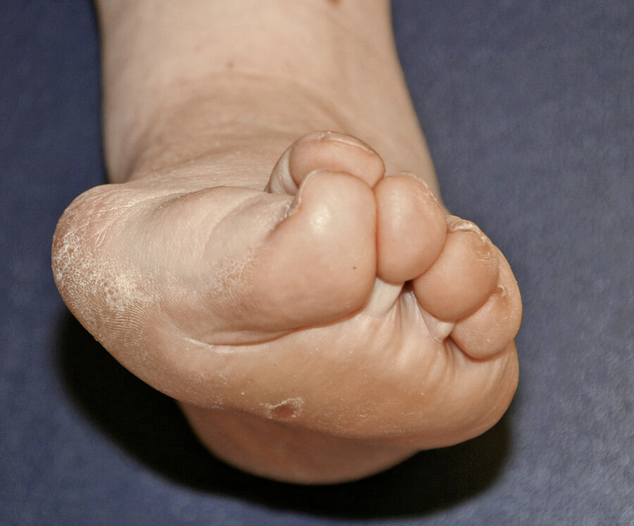 Derartige Deformitäten sind ebenfalls oft beim Diabetischen Fußsyndrom anzutreffen. Ulcera können dann durch unsachgerechtes Schuhwerk mit Druck der Zehen an der Schuhkappe oder durch die Fehlstellung an der Zehenkuppe entstehen (Abb. 7). Ursache ist das Muskelungleichgewicht der Fußmuskulatur oder eine vermehrte Anspannung der extrinsischen Fußmuskulatur bei Rückfußdeformitäten wie dem Knick-Senk/Plattfuß.