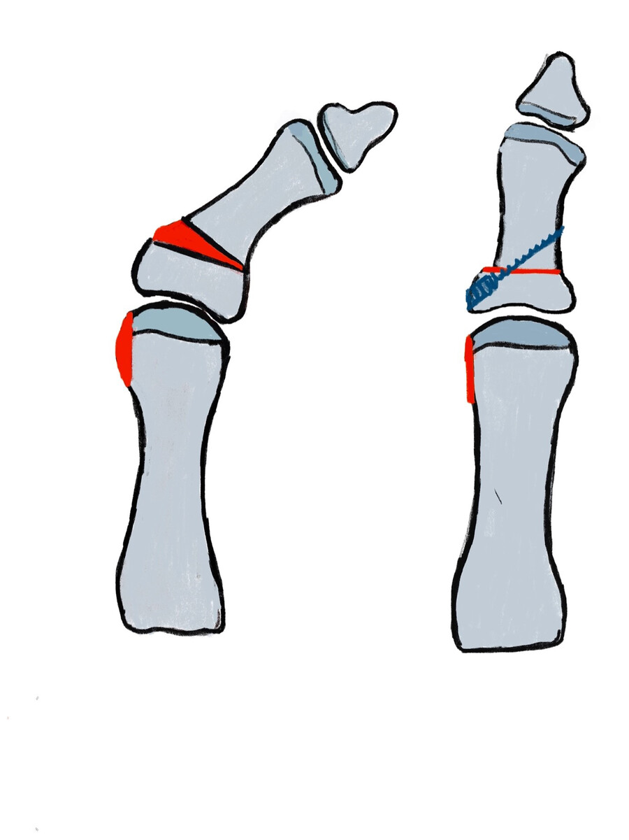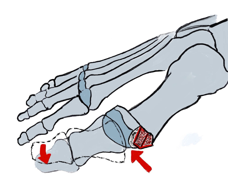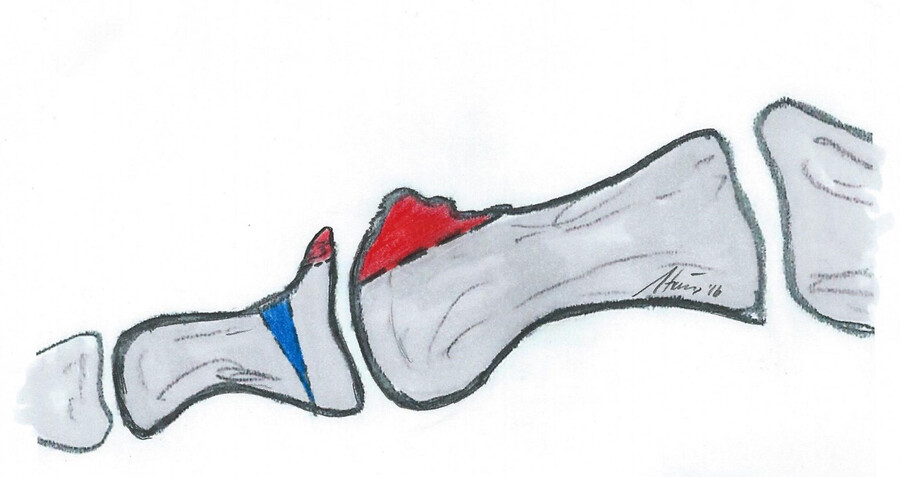 Bestehen Praeulcera durch Druck des ersten Strahles mit der Zehe D2 oder vermehrte Beschwielung durch einen Hallux valgus interpahlangeus kann die Akin-Osteotomie (zusätzlich) sehr hilfreich sein (Abb. 3). Bei der Akin-Osteotomie wird ein medial offener Keil aus dem Basisglied der Großzehe entnommen.