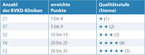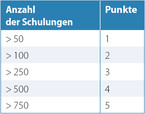 Auch die Anzahl der in den Häusern durchgeführten Schulungen wurde der „weissen Liste“ entnommen. Dafür wurden die beiden OPS-Ziffern 9-500 (Patientenschulung) und 8-984 (multimodale Komplexbehandlung bei Diabetes mellitus) gesucht und die angegebenen Schulungsmaßnahmen addiert. Je nach Anzahl erfolgt auch hier eine Staffelung der erreichbaren Punkte (Tabelle 3).