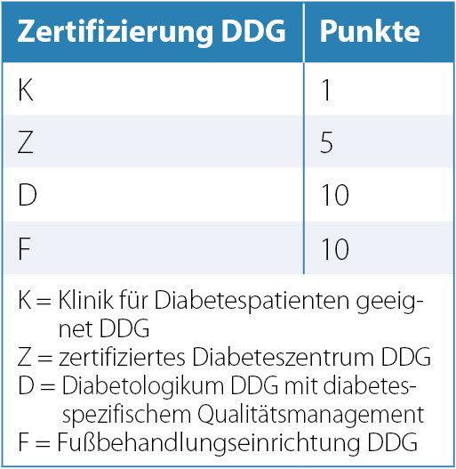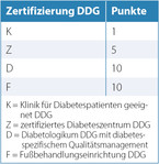 Der BVKD hält eine diabetesspezifische Zertifizierung der Krankenhäuser für wichtig. Diese ging deshalb wesentlich in die Bewertung der Akutkliniken ein. Entnommen wurde die Form der Zertifizierung der Webseite der Deutschen Diabetesgesellschaft. Hier wird in Diabetologikum DDG mit diabetesspezifischem Qualitätsmanagement (D) als höchste Qualitätsstufe, zertifiziertes Diabeteszentrum DDG (Z) und Klinik für Diabetespatienten geeignet DDG (K) als einfachste Form der Zertifizierung unterschieden.