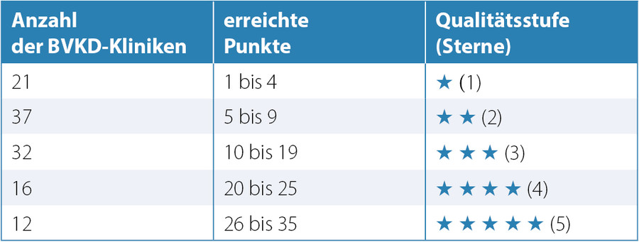 Maximal können die Akutklinken 35 Punkte erreichen. In Abstufung nach der erreichten Gesamtpunktzahl vergibt der BVKD entsprechende Zertifizierungsstufen. Die Kliniken mit dem höchsten Zertifizierungsgrad, den meisten mit Hauptdiagnose Diabetes mellitus behandelten Patienten und den meisten durchgeführten Schulungen sind unsere 5-Sterne-Häuser (Tabelle 4).