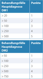 Bei der Datenbankabfrage im November 2017 waren die Qualitätsberichte von 2015 publiziert. Je nach Anzahl der mit Hauptdiagnose Typ 1- und Typ 2- Diabetes behandelten Patienten wurden unterschiedliche Punkte für das Ranking vergeben (Tabelle 2).
