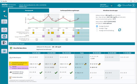 Einmal täglich wird der Insulinbedarf der Patient:innen neu ermittelt. GlucoTab berechnet aus dem bisherigen Therapieverlauf, wenn erforderlich, eine angepasste Tagesdosis, die vom medizinischen Personal bestätigt oder bei Bedarf angepasst wird. Die geplante Therapie bei Entlassung sowie weiterführende Maßnahmen können während des Aufenthaltes fortlaufend geplant und dokumentiert werden.