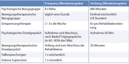 Eine Gruppe von acht bis zwölf Rehabilitandinnen und Rehabilitanden wird gemeinsam in einer sog. Bezugsgruppe behandelt. Die Bezugsgruppe erhält psychologische und bewegungstherapeutische als auch gegebenenfalls weitere indikationsspezifische Therapien gemäß der persönlichen Situation der Rehabilitanden getroffen.