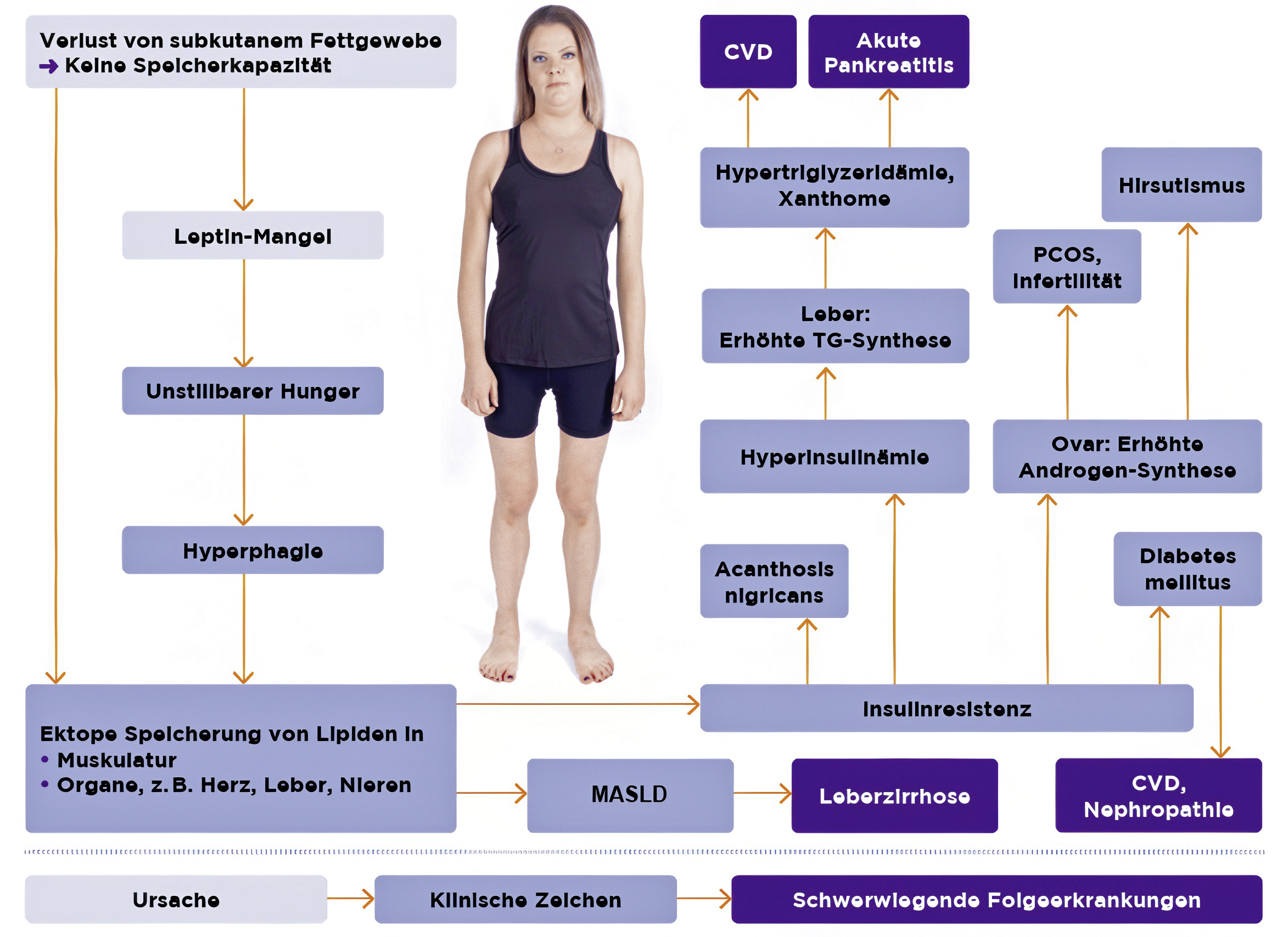 Der Mangel an Unterhautfettgewebe ist das Leitsymptom und erklärt die unzureichende Bildung von Leptin, dem Schlüsselhormon des Glukose- und Fettstoffwechsels, auch als "Hunger-/Sättigungshormon" bekannt. Leptinmangel verursacht häufig einen unstillbaren Hunger, der zu krankhafter Esssucht (Hyperphagie) führen kann. Für die Betroffenen ein Teufelskreis: Das Fehlen von Unterhautfettgewebe und die überhöhte Energiezufuhr verursachen ungewöhnliche Fettablagerungen in der Muskulatur und verschiedenen Organen, unter anderem der Leber, dem Herzen und den Nieren. Die verschiedenen, oft schwerwiegenden gesundheitlichen Komplikationen wie Insulinresistenz, Hypertriglyzeridämie, Organanomalien und kardiovaskuläre Schäden sind die Folgen der Lipodystrophie (Abb. 2).