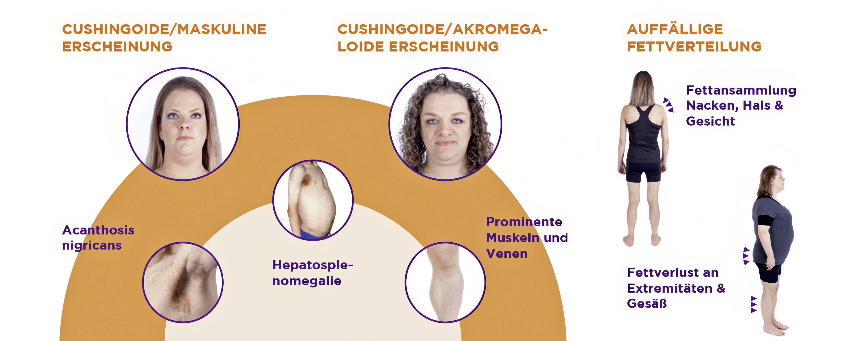 Ausgeprägte Muskeln – ohne übermäßig Sport zu treiben – weisen fast 90 Prozent der LD-Patient:innen auf. Die Hautveränderung Acanthosis nigricans findet sich bei 80 Prozent. Akromegaloide Merkmale durch vergrößerte Hände, Füße, Kinn, Nase oder Ohren sind bei fast 80 Prozent der GL-Betroffenen und fast 60 Prozent der PL-Betroffenen erkennbar. Oft verrät auch ein aufgeblähter Bauch aufgrund einer Leber- und/oder Milzvergrößerung (Hepato-/Splenomegalie), dass mehr hinter der Diabeteserkrankung steckt. Betroffene einer PL weisen zudem fast alle ein Erscheinungsbild ähnlich dem Cushing-Syndrom mit großflächigem Gesicht ("Mondgesicht") und Stiernacken auf. Oft sind bei dieser Form Arme und Beine eher schlank und muskulös wirkend.