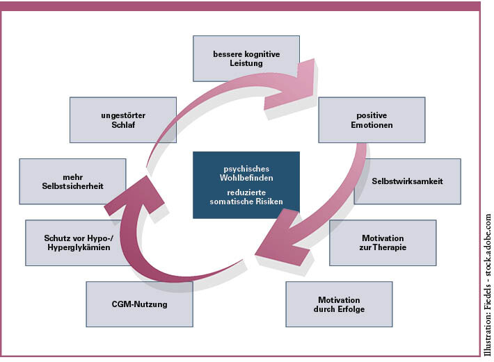 Da Menschen mit Diabetes häufiger unter diabetesbezogen Belastungen und psychischen Komorbiditäten leiden, sind therapeutische Maßnahmen, die die Selbstwirksamkeit erhöhen, im Kontext des Diabetes wünschenswert. Studienergebnisse zeigen zum einen, dass Personen, die von CGM profitieren eher geringere diabetesbezogene Belastungen, eine positive Einstellung zu Technologien und eine erhöhte Selbstwirksamkeit [Messer 2017] und eine bessere glykämische Kontrolle aufweisen [Rasbach 2015]. Zum anderen scheint die Anwendung von CGM und die Beschäftigung mit den Ergebnissen die Selbstwirksamkeit der Nutzer zu erhöhen [Smith 2019].