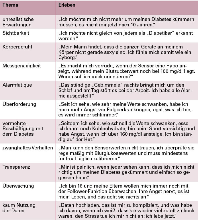 Mögliche Belastungen durch ein CGM-System ergeben sich durch den ständig zu tragenden Sensor incl. Transmitter und einem Display (Smart-Phone), das ebenfalls immer zur Verfügung stehen muss. Nicht jede Person mit Diabetes möchte zudem in der Öffentlichkeit durch einen Sensor sichtbar auf die Stoffwechselstörung hinweisen.