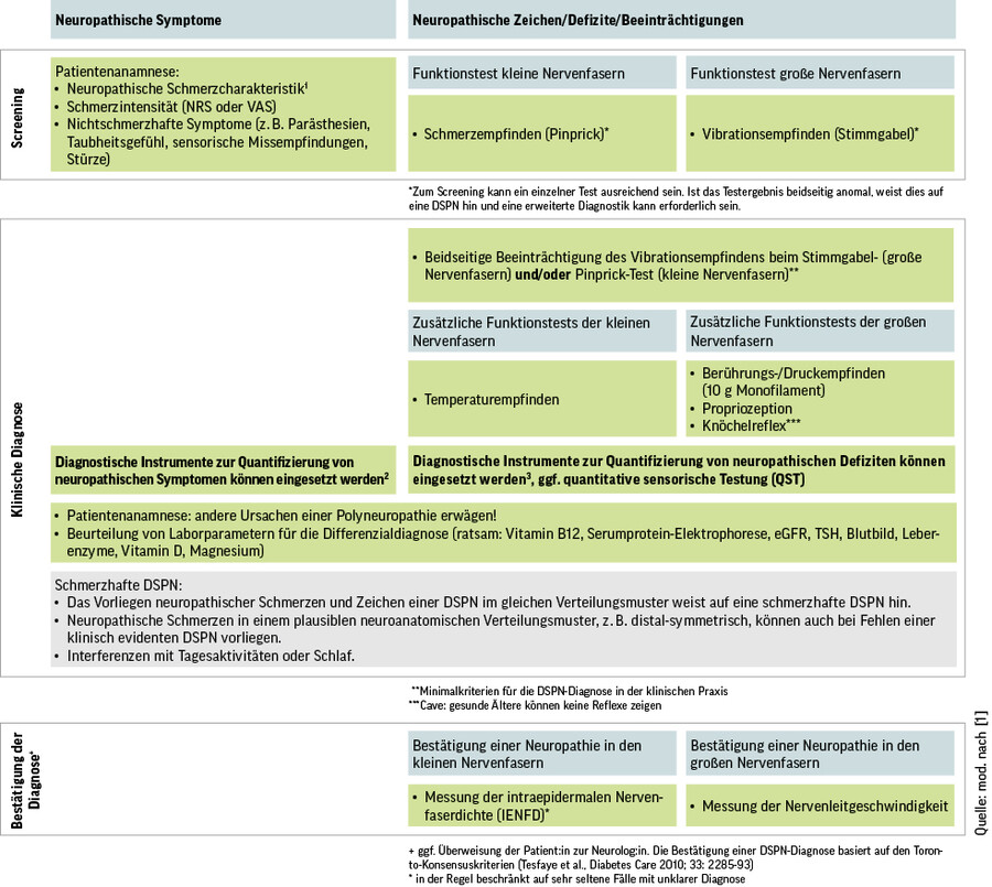 Das Expertengremium weist darauf hin, dass meist sowohl die kleinen als auch die großen Nervenfasern geschädigt sind. Deshalb sollten bei einem Screening auf DSPN geeignete Tests zur Beurteilung unterschiedlicher Nervenfasertypen eingesetzt werden (Abb. 1).