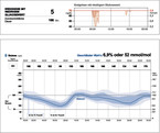 Abb. 3a: Der Fall aus der Praxis: Zwischen 6 und 8 Uhr treten periodisch Werte < 54 mg/dl bzw. < 3,0 mmol/l auf. Der Interquartil-Bereich ist von 10 bis 14 Uhr und der Interdezil-Bereich von 10 bis 18 Uhr zu breit (6).