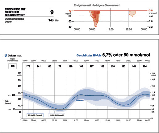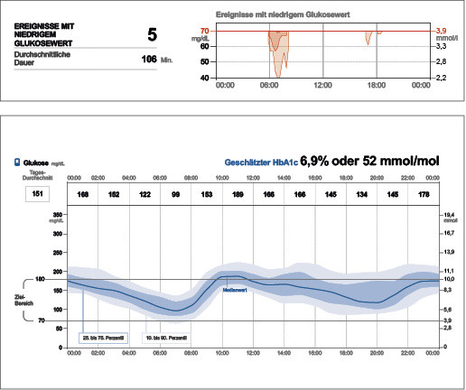 Eine weitere Folge kann sein, dass Menschen mit Diabetes höhere Werte in Kauf nehmen, um erneute Hypoglykämien zu verhindern. Zur Analyse der Hypoglykämien ist neben der Mustererkennung im AGP auch das Betrachten der Einzeltage ratsam.