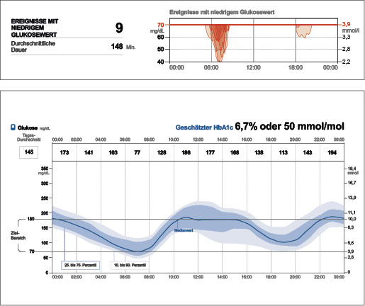 Nach dem im Dezember 2017 publizierten Konsens von Danne et al. sollten CGM-Daten genutzt werden, um unter anderem Hypoglykämien und Glukosevariabilität zu ermitteln (1). Indiziert ist der Einsatz von CGM-Systemen für die Beurteilung der Glykämie und für Therapieanpassungen bei allen Menschen mit Typ-1-Diabetes, bei Menschen mit Typ-2-Diabetes mit intensivierter Insulintherapie, bei insulinbehandeltem Diabetes mit Hypoglykämiewahrnehmungsstörung und in der Schwangerschaft mit vorbestehendem insulinbehandeltem Diabetes (5).