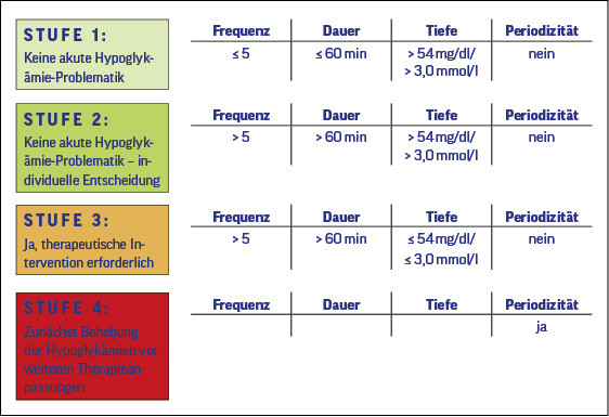 Mit diesen Parametern können Hypoglykämien klassifiziert und in Stufen hinsichtlich des Schweregrads eingeteilt werden, wie in Tabelle 1 dargestellt. Die Tabelle zeigt weitere Empfehlungen der Experten zu der Frage, wann Therapieanpassungen bei Hypoglykämien empfohlen werden (6).