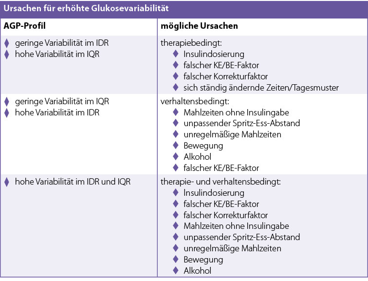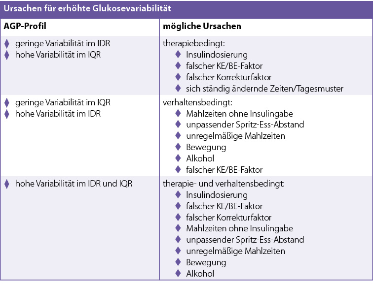 Die Glukosevariabilität kann mithilfe des IQR und des IDR differenziert betrachtet werden. Ein verbreiterter IQR weist in der Regel auf eine nicht passende Therapie hin (Tab. 2). Dagegen liegen die Ursachen für einen breiten IDR eher im Verhalten des Menschen mit Diabetes, wie ein unregelmäßiger Tagesablauf, das Auslassen oder Verringern eines Bolus oder ein falscher Spritz-Ess-Abstand (2, 6) (Tab. 2). Ein unregelmäßiger Tagesablauf kann jedoch sowohl zu einem breiteren IDR wie auch zu einem breiteren IQR führen (2).