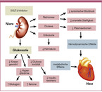 Zwei wesentliche Gründe werden für den therapeutischen Effekt der Gliflozine bezüglich Herzinsuffizienz diskutiert: 1) Verschiebung des kardialen Metabolismus hin zur vermehrten Verstoffwechselung von Ketonkörpern als "cardiac super fuel" sowie 2) hämodynamische Effekte durch die glukosebedingte verbesserte Flüssigkeitsbilanz. Weiter werden moderate Gewichtseffekte der SGLT-2-Inhibitoren, Blutdrucksenkung, Reduktion des oxidativen Stresses und der arteriellen Steifigkeit sowie Reduktion der Sympathikusnerv-Aktivierung diskutiert (Abbildung 1) (53).