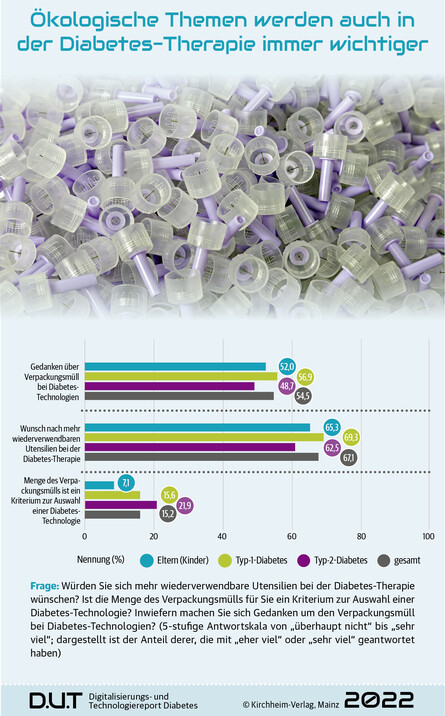 Menschen mit Diabetes ist diese Problematik durchaus bewusst. Auf die Frage „Inwiefern machen Sie sich Gedanken um den Verpackungsmüll bei Diabetes-Technologien?“ antworteten 56,9 Prozent der Menschen mit Typ-1-Diabetes, 52,0 Prozent der Eltern von Kindern mit Typ-1-Diabetes und 48,7 Prozent der Menschen mit Typ-2-Diabetes, dass sie sich Gedanken über den Verpackungsmüll machen.