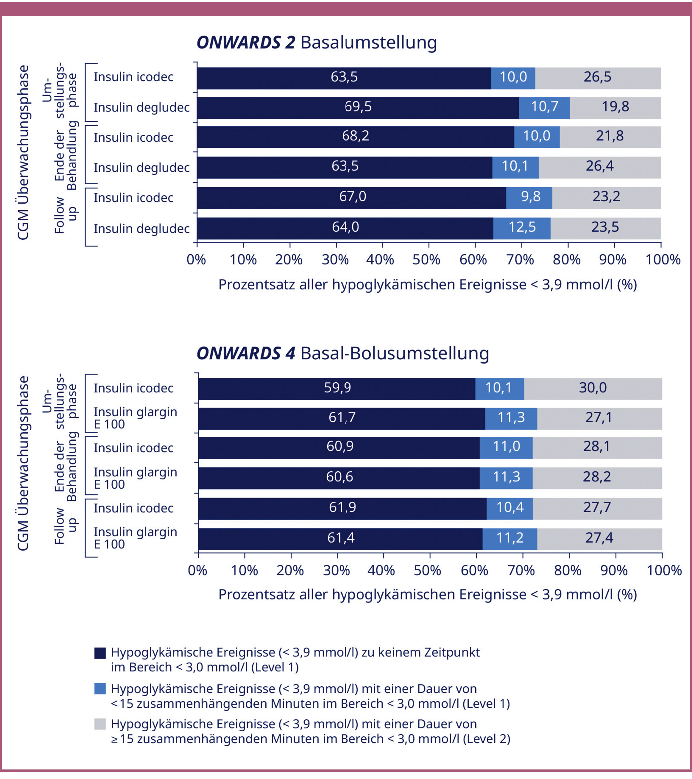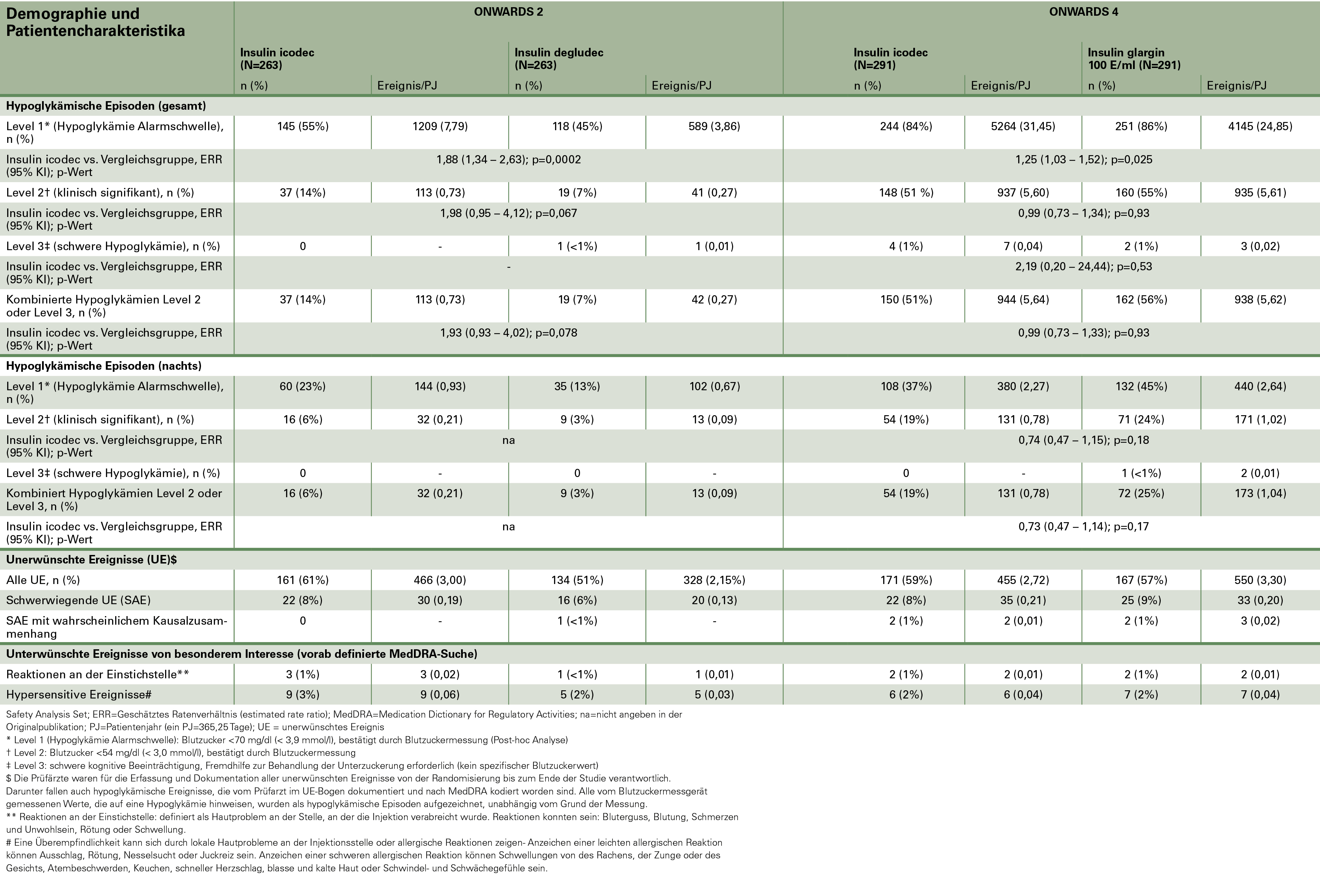 In der ONWARDS-4-Studie traten in beiden Behandlungsgruppen die kombinierten Hypoglykämien der Level 2 und 3 etwa gleich häufig auf (Insulin icodec: 5,64 Ereignisse/Patientenjahr; Insulin glargin 100 E/ml 5,62 Ereignisse/Patientenjahr; Tabelle 3). Anzumerken ist, dass in der ONWARDS-4-Studie alle Teilnehmer zusätzlich Bolus-Injektionen erhielten, was die im Vergleich zu ONWARDS 2 insgesamt höhere Hypoglykämierate erklärt. Aus anderen Treat-to-Target-Studien sind kombinierte Level-2- und -3-Hypoglykämie-Ereignisraten in gleicher Höhe bekannt (1,85 bis 12,7 Ereignisse pro Patientenjahr unter Insulin glargin 100 E/ml, 1,52 bis 10,4 Ereignisse pro Patientenjahr unter Insulin degludec) [Mathieu 2023].