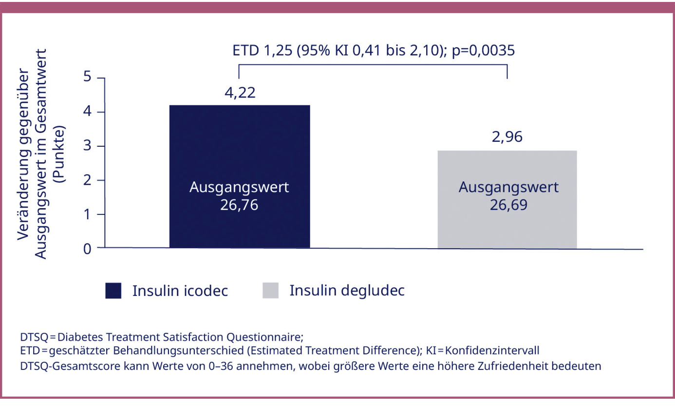 Die Behandlungszufriedenheit in der Onwards 2 Studie stieg im Studienarm mit Insulin icodec signifikant stärker an als in der Vergleichsgruppe mit Insulin degludec, mit einem Unterschied im DTSQ-Gesamtscore von 1,25 (95%-KI [0,41-2,10]; p=0,0035) (Abbildung 3). Vor allem nahm die Zufriedenheit in Bezug auf die einzelnen Items zur Flexibilität und zur Bequemlichkeit der Behandlung im Studienarm mit einmal wöchentlichem Insulin icodec mehr zu als in der Insulin degludec Gruppe, ebenso die Bereitschaft zur Fortführung und zur Weiterempfehlung der Behandlung.