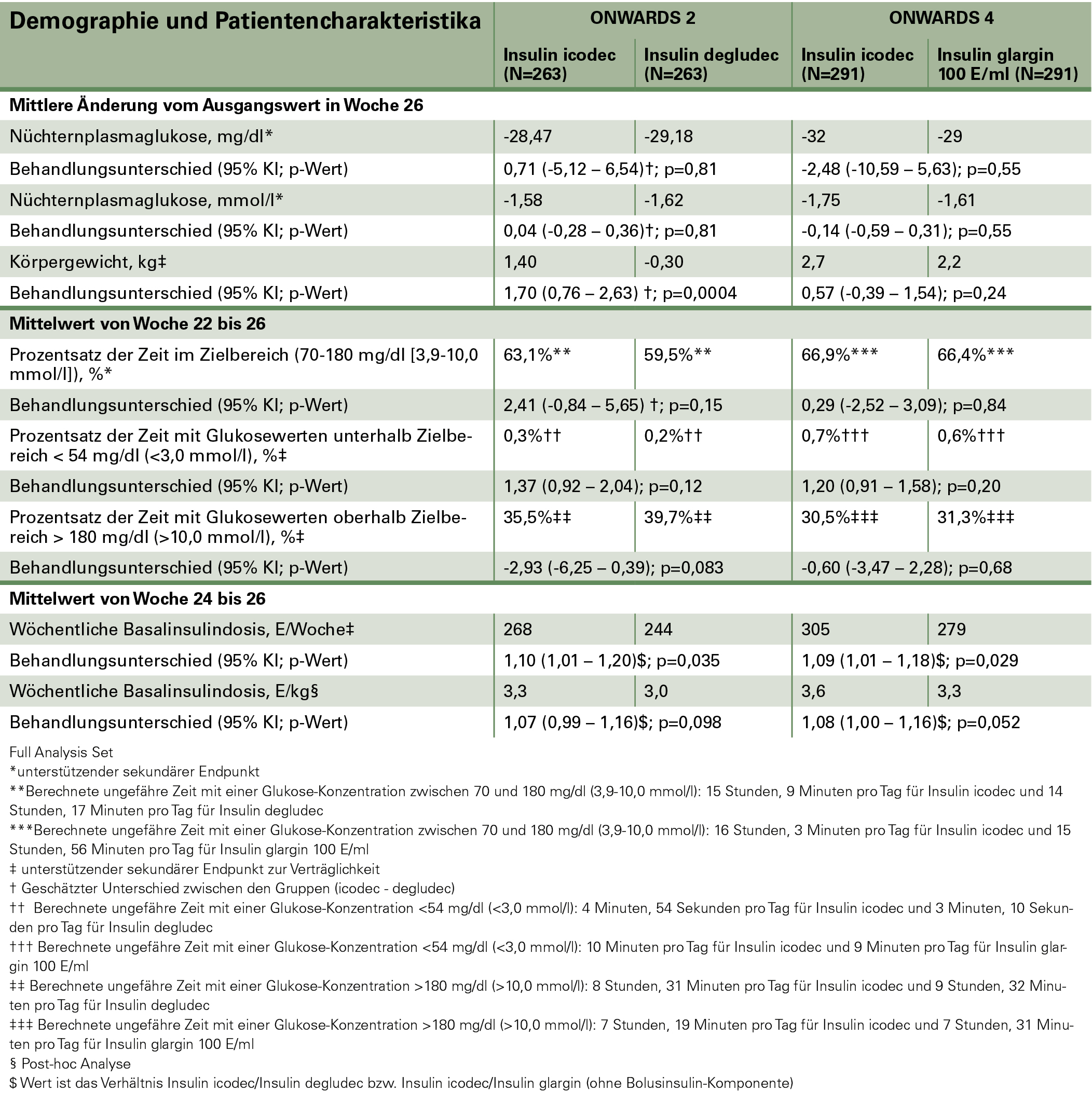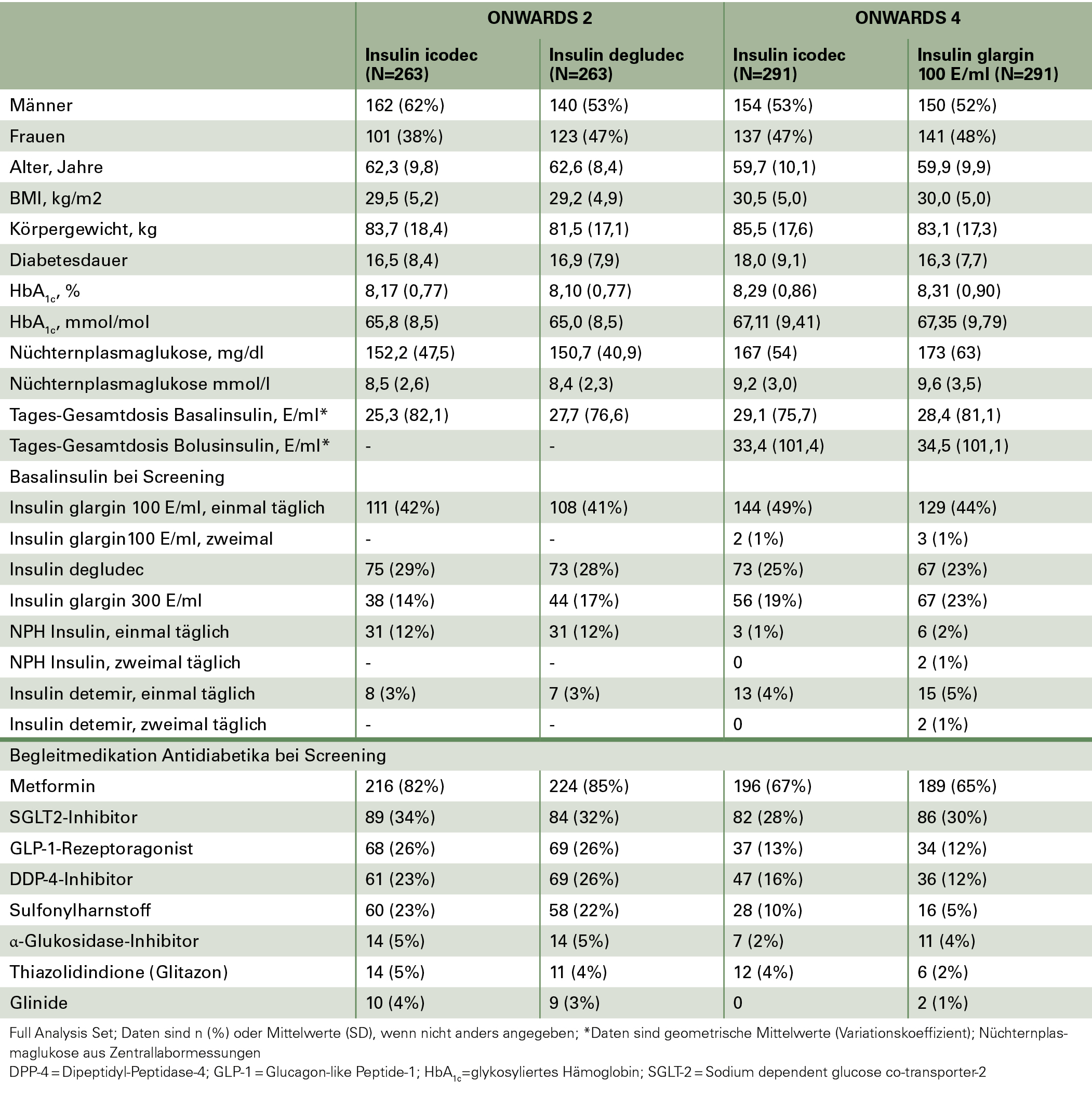 Insgesamt 526 Patienten in der ONWARDS-2-Studie und 582 Patienten in der ONWARDS-4-Studie wurden mit einmal wöchentlich Insulin icodec oder einmal täglich mit einem Basalinsulin (Insulin degludec in ONWARDS 2, Insulin glargin 100 E/ml in ONWARDS 4) behandelt. In beiden Studien waren die Patientencharakteristika beider Behandlungsarme vergleichbar, bis auf geringfügige Unterschiede zwischen den Gruppen im Körpergewicht, Geschlechterverhältnis, Erkrankungsdauer und der Gesamtinsulindosis zu Studienbeginn. Alle Teilnehmer wiesen zu Beginn eine verbessererungswürdige Glukosestoffwechsellage auf (HbA1c im Mittel zwischen 8,1 und 8,3%), trotz bestehender Insulintherapie. Außerdem erhielten die meisten Teilnehmer zu Beginn der Studie gleichzeitig mehrere Antidiabetika, was repräsentativ für die klinische Praxis ist, und es gab einen hohen Anteil der Teilnehmer, die SGLT2-Inhibitoren und GLP-1-Rezeptoragonisten erhielten. Dies entspricht der klinischen Praxis, da die meisten Teilnehmer bereits langjährig an T2DM erkrankt waren (durchschnittliche Diabetesdauer 16-18 Jahre) (Tabelle 1).