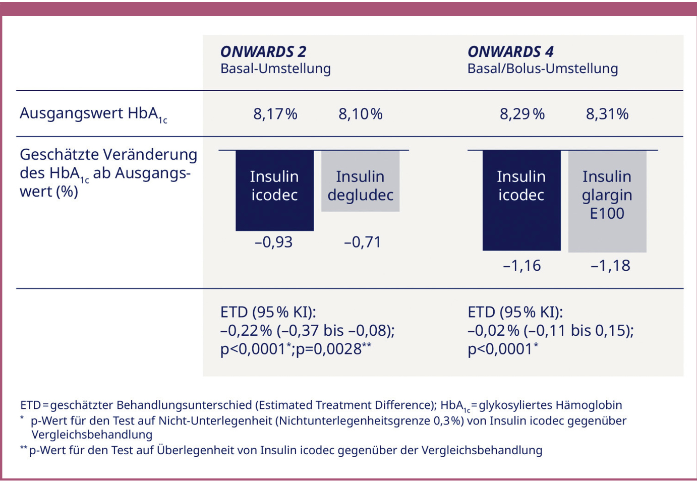 In den beiden internationalen Studien ONWARDS 2 [Philis-Tsimikas 2023a] und 4 [Mathieu 2023] wurde die Wirksamkeit und Sicherheit von einmal wöchentlich Insulin icodec im Vergleich zu einem einmal täglich verabreichten Basalinsulin bei Insulin-vorbehandelten Patienten bewertet. In die multizentrischen, open-label, Treat-to-Target-Studien wurden mit Insulin vorbehandelte Patienten mit langjährigem T2DM und nicht ausreichender glykämischer Kontrolle (HbA1c 7,0-10% bzw. 53-86 mmol/mol) auf die Behandlung mit einmal wöchentlich Insulin icodec oder einem einmal täglich verabreichten Vergleichsinsulin (Insulin degludec oder Insulin glargin 100 E/ml) randomisiert und über 26 Wochen behandelt. Zusätzlich zur Insulintherapie durften Patienten in der ONWARDS-2-Studie ihre blutzuckersenkende Begleitmedikation fortsetzen (außer Sulfonylharnstoff und Glinide). In der ONWARDS-4-Studie wurden beide Behandlungsgruppen im Rahmen des Basal-Bolus-Regime weiterbehandelt und erhielten das jeweilige Basalinsulin kombiniert mit 2-4 mal täglichen Bolus-Insulin-aspart-Injektionen.