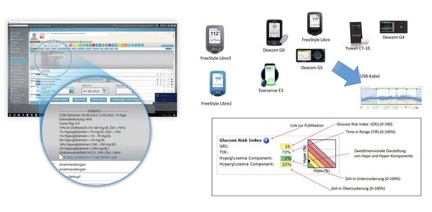 Auch die aktuelle Programmversion zum 30jährigen Jubiläum bringt wieder zahlreiche Neuerungen. So lassen sich nun auch die rtCGM FreeStyle Libre 2+3 sowie Dexcom G5+G6 einfach per Kabel einlesen, der Umweg über eine Hersteller-Cloud ist nicht erforderlich. Neue Kennzahlen wie der Glucose-Risk-Index (GRI) sowie die Time in Tight Range (TiTR) werden von DIABASS ebenfalls schon berücksichtigt. Der intelligente Bescheinigungsassistent glucoDOC erlaubt eine schnelle und einfache Erstellung von Bescheinigungen und Anträgen, beispielsweise für Hilfsmittelanträge (rtCGM), zur Vorlage bei der Führerscheinbehörde oder zur Begründung einer Teststreifenverordnung zur Regressvermeidung. Dabei werden nicht lediglich Textbausteine aneinandergereiht, sondern es wird mit wenigen Klicks ein individualisiertes und ausführliches Dokument erzeugt, welches wie manuell erstellt anmutet.