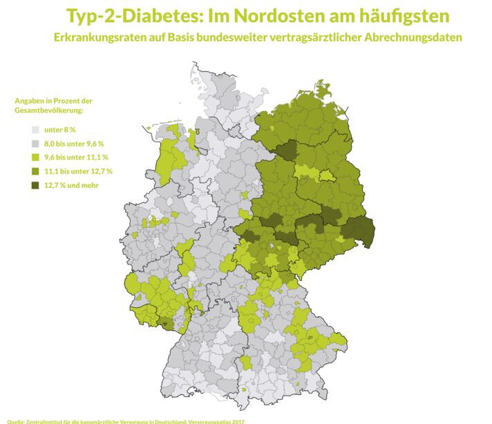 Deutlich zeigt der aktuelle Versorgungsatlas des kassenärztlichen Zentralinstituts: Die Landkreise mit der höchsten Prävalenz an Diabetes-Typ 2 liegen fast ausschließlich in den fünf östlichen Bundesländern – korrespondierend u.a. mit dem dort deutlich höheren Durchschnitts-Lebensalter.