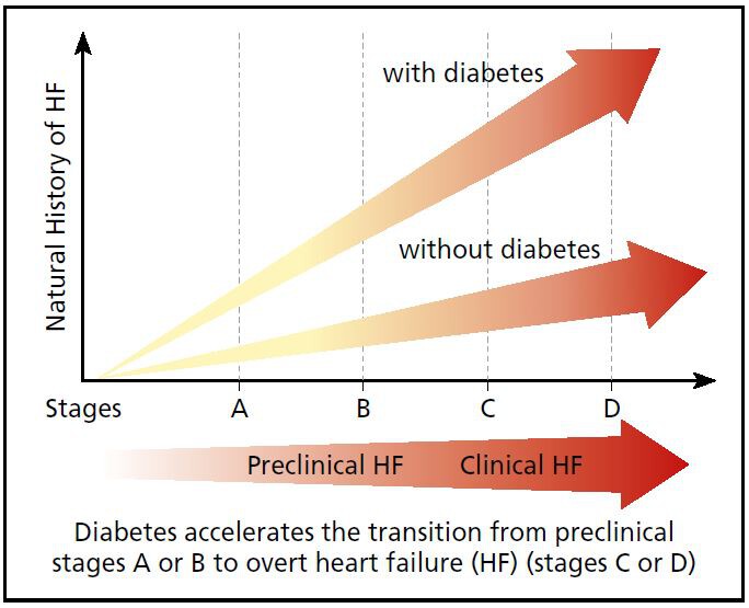 In diesem Zusammenhang erscheint das Papier aus der ARIC-(Atherosclerosis Risk in Communities)-Studie von besonderer Bedeutung, das auf den Zusammenhang von entgleistem Metabolismus und HF-Progression hinweist. Knapp 4800 Erwachsene wurden zu Beginn der Beobachtungsperiode in Probanden mit Risikofaktoren-Phänotyp ohne und mit strukturellen Kriterien einer Herzerkrankung eingeteilt. Strukturelle Veränderungen einer Herzerkrankung lagen vor, wenn z.B. proBNP erhöht oder kardiales Troponin T nachweisbar waren, jedoch ohne Zeichen einer klinische apperzepten Herzschwäche. Über eine fast achtjährige Beobachtungszeit lag die Inzidenz einer klinisch relevanten HF zwischen 1,6 bis 7 über dem Risiko der nicht-diabetischen Kontrollkohorte. Dabei waren insbesondere Diabetiker mit strukturellen Herzveränderungen (HFpEF: Heart Failure with preserved Ejection Fraction) am stärksten betroffen und Diabetespatienten, bei denen sich eine Dekompensation in signifikant jüngerem Lebensalter, bzw. nach signifikant kürzerer Zeit, auftrat. Besonders auffällig war die inverse Beziehung zur HbA1c-Kontrolle, was die Autoren neben einer erhöhten HF-Inzidenz bei Menschen mit Diabetes zu der Forderung einer besonders korrekten Kontrolle aller Risikofaktoren, aber auch insbesondere der Blutglukose in dieser Hochrisikopopulation veranlasst. Damit liefert die ARIC-Studie indirekt Belege für die Driver-Funktion des Diabetes mellitus als Faktor, bzw. der unkontrollierten Hyperglykämie, für die Transition der präklinischen Herzschwäche (HFpEF) in die manifeste Herzinsuffizienz (HFrEF Heart Failure with reduced Ejection Fraction) (Abb. 1).