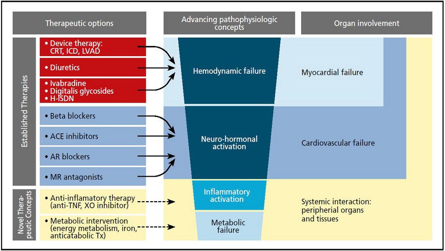 Diese Daten müssen komplementär zur großen Effektivität des Einsatzes von SGLT-2 (Sodium glucose linked transporter 2)-Inhibitoren bei HFrEF, aber auch bei HFpEF (EMPEROR Preserved-Study, Deliver-Study) verstanden werden, was das Konzept vom "Metabolic failure to heart failure" nachhaltig unterstützt. Im Jahr 2014 hatte Prof. Wolfram Döhner auf die Bedeutung der metabolischen Kontrolle für die Initiierung des pathogenetischen Prozesses in die manifeste Herzinsuffizienz lange vor der neurohormonalen Aktivierung hingewiesen (Abb. 2). Daher sind pleiotrope Off-Target-Effekte neben der antihyperglykämischen Wirkung, insbesondere auf das Inflammasom, den myokardialen Substratstoffwechsel, die Sympathikus-Aktivierung, die kardiale und renale Hämodynamik, für Menschen mit Diabetes als besonders organprotektiv einzuschätzen. Die Gruppe der SGLT-2-Hemmer hat in den entsprechenden Indikationen Herzinsuffizienz und Niereninsuffizienz bereits entsprechende Zulassungslizenzen erreicht.