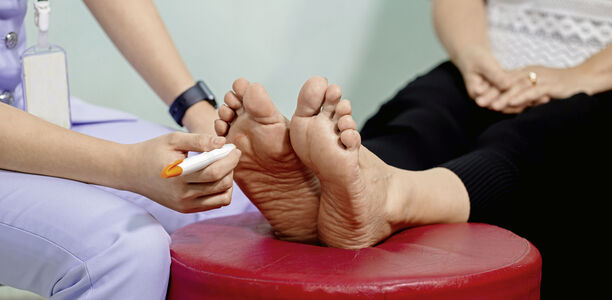 Das Ergebnis: Alle 41 Patient:innen mit schmerzhafter diabetischer Polyneuropathie erfüllten die Kriterien für Nerven-bedingte (neuropathische) Schmerzen. Bei 22 Prozent von ihnen wurde zusätzlich eine weitere Schmerzform festgestellt, die ihre Ursache in der Muskulatur hat: Die sogenannten myofaszialen Schmerzen sind durch aktive Muskeltriggerpunkte gekennzeichnet. Diese Verhärtungen im Muskelgewebe lösen beim direkten Abtasten oder bei körperlicher Belastung Schmerzen aus. Bei den untersuchten Betroffenen befanden sich die schmerzhaften Muskeltriggerpunkte in den vorderen oder hinteren Wadenmuskeln und in den kleinen Fußsohlenmuskeln. Bei 89 Prozent der Teilnehmenden traten sie beidseitig auf. In den überwiegenden Fällen (78 Prozent) waren sie symmetrisch ausgeprägt.
