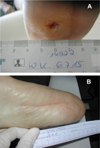 Eine 56-jährige Patientin (Akademikerin) litt seit über 40 Jahren an Typ-1-Diabetes mellitus. Sie wurde seit ihrer Manifestation intensiv mit Insulin behandelt, aber aus panischer Angst vor Hypoglykämien lagen ihre Blutzuckerwerte schon immer mehrheitlich in einem hyperglykämischen Bereich (HbA1c: 10,9 %). Sie hatte seit mehr als fünf Jahren eine bekannte periphere Neuropathie, und seit mehr als zwei Jahren bestand ein nicht heilendes chronisches Geschwür unterhalb der linken Ferse (Abbildung 1A). Drei Monate vor unserer Intervention wurde in einem Angiogramm ein vollständiger Verschluss der Arteria fibularis festgestellt (Abbildung 2A). Am linken Bein waren keine Fußpulse tastbar, und mit der Laser-Doppler-Fluxmetrie konnte dort auch kein Blutfluss nachgewiesen werden. Aufgrund dieser Befunde wurde die Amputation des linken Unterschenkels als einzige verbleibende Option zur Verbesserung der Prognose der Patientin in Betracht gezogen. Als letzter Ausweg und unterstützt durch frühere (prä)klinische Ergebnisse [Ozegowski 2008, Burgard 2015] wurde versucht, den katastrophalen Zustand durch die intravenöse Anwendung von Hyaluronidase zu verbessern (experimenteller Heilversuch, Off-Label).