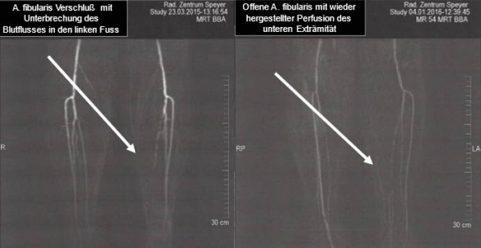 Es wird davon ausgegangen, dass die Hyaluronidase-Infusionen eine breitere Remodulation der Glykokalix bewirken, die über einen Zeitraum von mehreren Wochen und Monaten anhält und die Patientin wurde daher in der Folgezeit mehrmals wieder einbestellt. Das Ulkus heilte innerhalb der nächsten drei Monate vollständig ab (Abbildung 1B). Im Angiogramm nach 6 Monaten, das von demselben Radiologen durchgeführt wurde, der auch die vorherige Untersuchung vorgenommen hatte, wurde eine Wiedereröffnung der Arteria fibularis festgestellt (Abbildung 2B). Die Fußpulse waren tastbar, und mittels Laser-Doppler-Fluxmetrie wurde ein erheblicher Blutfluss gemessen. Die geplante Amputation wurde abgesagt, und die Patientin konnte ihr normales Leben mit besserer Blutzuckereinstellung (HbA1c nach 6 Monaten 7,5 %) und guter Hoffnung für einen langfristigen Erhalt des Beins fortsetzen (bisheriger Beobachtungszeitraum: 7 Jahre).